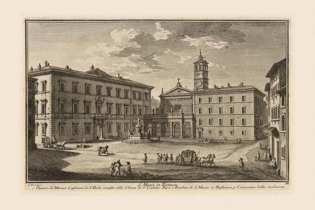 Piazza S. Maria in Trastevere has been the focal point of Rione Trastevere since late antiquity. It is located near the intersection of two ancient streets: Via Aurelia Vetus which defines the right side of the piazza, and the street (now called Via della Scala) leading to the right transept of the church from the Porta Settimiana (see Plate 14) in the Aurelian walls. It is named after the church of S. Maria in Trastevere (2) at the center of the image, which is reputed to be the oldest church in Rome, although the present structure dates from the mid 12th century. The portico in front of the church was added by Carlo Fontana in 1702. The Canonica (3) houses the clergy which officiates at the church. Palazzo S. Calisto, which dominates the left side of this print, was built during the reign of Pope Paul V Borghese (1606-1621). It is attached to the church of S. Calisto (NN 1164) around the corner facing onto the piazza of the same name. Formerly symmetrical about the main door, the palace received two extensions to the west, as can be seen by examining the quoins on its right side. Vasi reveals the building to be very shallow by showing sunlight shining from the inside through the door onto Piazza S. Maria; the Nolli map corroborates this point. As the Nolli map illustrates, the buildings on the right edge of the print form a perfectly straight line, whereas Vasi gives them a decided curve.