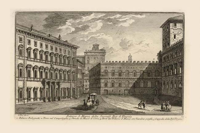 Except for the Palazzo Venezia and the distant bell tower of the Campidoglio, every building in this view was demolished or moved elsewhere in the late 19th and early 20th centuries, in order to make way for the great white monument dedicated to Victor Emanuel II. The relatively small, defined area of Piazza Venezia, which this print shows so clearly, then became a vast, undefined, amorphous space. Palazzo Venezia was started in 1455 by the Venetian Cardinal Pietro Barbo, as a residence built around the Venetian national church of S. Marco, Plate 115 (thus the dual naming of the palace). It was completed by his nephew after Pietro was elected Pope Paul II (1464-71). The building became the Venetian embassy after 1564. Vasi shows a small chapel and doorway (5) leading to the passage between this piazza the piazza associated with the church. The crenellated building at the center of this view is often referred to as the "Palazzetto Venezia" (4) but was really a courtyard/garden added to the corner of the main building in the 1460s. Paul III (1534-49) connected the palazzetto (small palace) to the Campidoglio by means of an elevated passageway spanning two streets, one is the Strada di Macel dei Corvi (3) and leading to the tower (2) which he had built on that hill, next to the monastery of Ara Coeli. The Nolli map shows this passage as two parallel lines terminating in a winding cordonata (stair-ramp) leading up to the square tower. The palazzetto was demolished and rebuilt (very approximately) at the southwest corner of Palazzo Venezia in 1911. The Baroque Palazzo Bolognetti (1) was demolished in 1900 together with Palazzo Parracciani (NN 276) beyond it. The annual race of the riderless wild horses (barberi) involved a course down the Via del Corso (in Vasi's day it was simply the "Corso" – the only one in town) terminating at the short street between the Palazzo Parracciani and the Palazzetto Venezia, known as the Ripresa dei Barbari (NN 111). This name derives from the practice of hanging a large sheet across the street at this point to stop the horses. Vasi shows two additional plates which extend this view. In the contiguous print, Plate 39, he completes the Palazzo Venezia by swinging his gaze clockwise to the west and in the next continuing this sequence, Plate 170, he directs the viewer's attention north along the Corso to Piazza del Popolo in the distance.