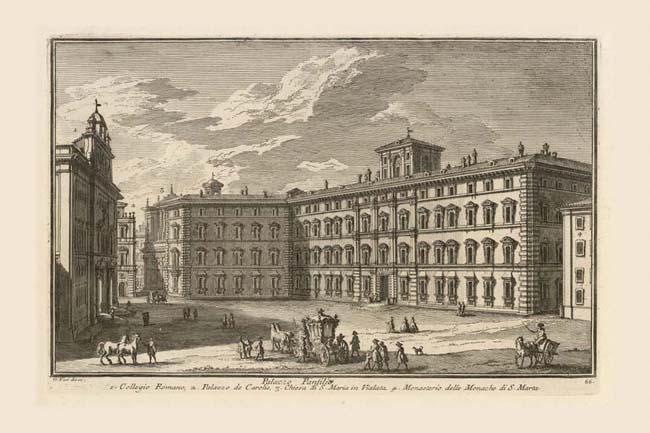 When the Collegio Romano (1) a Jesuit school, was begun in 1582, this piazza was much smaller in area than it appears in this view (see Plate 162 for a companion view of the same piazza). At that time, a palazzo belonging to the Salviati family occupied most of the open space visible in the print, with only a narrow street separating it from the Collegio. In 1659 the Jesuits bought and demolished Palazzo Salviati so as to enlarge and regularize the piazza in front of their school. At the same time the adjacent Palazzo Aldobrandini was acquired by the Doria Pamphilj and reworked by Del Grande with two perpendicular facades on the piazza, visible in this print. The beginning of a third facade by the same architect can be seen on the street leaving the piazza on the right. This view of the Palazzo Panphilj and its immediate surroundings is augmented by two other views by Vasi, one from Via del Plebiscito to the north, Plate 39, the other from Via del Corso to the east, Plate 44. Vasi shows the shorter wing of the palazzo to be only one bay deep, backing onto the apse of the church of S. Maria in Via Lata (3) whose facade is on Via del Corso. In the first half of the 18th century the Doria Pamphilj consolidated their vast palazzo and developed new facades on Via del Corso and Via del Plebiscito. At the left we see a corner of Palazzo de Carolis (2) now the Banca di Roma, designed by Specchi 1724 while in the right foreground Vasi shows a portion of the church and nunnery of S. Marta (4).