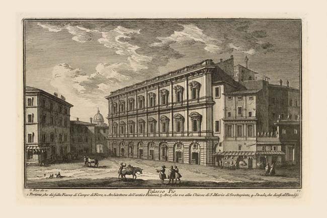 Nolli refers to the Palazzo Pio in his index as Palazzo Pio con le ruine del Teatro di Pompeo (...with the ruins of the theater of Pompey) and to the the urban space in front of it as Piazza del Biscione (NN 637). "Biscione" (a large snake) gives the clue to the origins of the palazzo because it refers to the eel ("biscione" for the locals) in the coat of arms of the Orsini who turned the ruined 1st century BC theater into a medieval stronghold. After various accretions over time and changes of ownership, this facade element, one bay deep, was added by Arcucci in 1667, but was left incomplete as the unfinished arches at both ends reveal. At the obtuse-angled corner of the building on the right, had the incomplete arch been continued it would have cut into the still extant, protuberant part of the earlier structure (2) facing onto the contiguous view of the Campo de' Fiori, Plate 28. The open portal (3) next to the left end of the palazzo is the entrance to a covered passage leading to the curved Piazza di Grotta Pinta (a reference to the frescoes in the underground ruins of the theater) where the semi-circular shape of the original theater is clearly revealed in the buildings constructed over it. Above the portal Vasi shows an impossible view of the dome of the nearby S. Andrea della Valle, Plate 134. The open portal (1) on the extreme right edge of the print opens onto a court since filled in by a building currently serving as a movie theater. Trailing off the scene to the left, shows the Via Paradiso (4) heading toward the Palazzo Massimo, Plate 76.