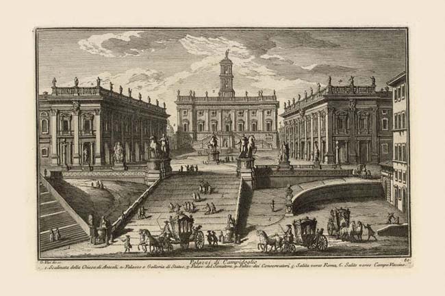 Vasi's representation of Michelangelo's mid-16th century masterpiece of urban planning brings to mind the 1569 perspective view of the same site by Duperac. But while both are taken from an elevated point, Vasi's view is lower than Duperac's, thereby showing less of the piazza surface. It is also avoids the axial symmetry of the earlier view, which allows Vasi to give a clear view of the central element of the double stair in front of the Palazzo Senatorio (3). Both artists show the short facades of the Palazzo Nuovo (2) and the Palazzo dei Conservatori (4) in full frontal view, which amounts to a considerable distortion because in fact they do not lie on the same plane. Neither artist is able to suggest the trapezoidal plan of the space between these two non-parallel buildings, a near impossibility in perspective representation. Perhaps more successful is Vasi's rendering of the trapezoidal cordonata (5) (stair-ramp) leading up to the piazza. The elaborate geometric pattern in the Duperac view was not executed until 1940, so Vasi shows the radial pattern which existed in his day though he barely suggests this. Through the left angle of the piazza, above the series of descending roofs which suggest the cordonata sloping down to the Roman Forum (6), we see the dome of SS. Martina e Luca, Plate 42. The scalinata (1) (large stair) in the left foreground climbs up to the church of S. Maria in Ara Coeli, Plate 130A. During the 1930's many of the buildings and features along the edge of the Capitoline Hill were demolished including the building on the right (NN 983) and the curved cordonata passing behind it which was replaced by a switchback street.