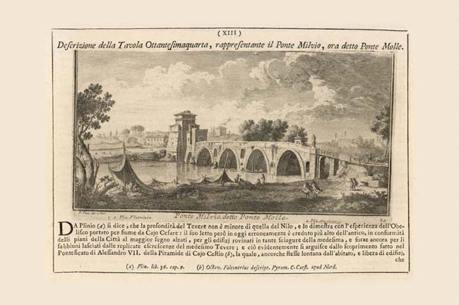 The ancient Pons Mulvius or Ponte Milvio was a key bridge outside the city for all roads heading north from Rome. It is located on Via Flaminia (1) positioned in almost a straight line from Porta del Popolo, Plate 1. Beyond the bridge the ancient Via Casia (2) diverges from Via Flaminia as it heads toward Florence. In the print Via Cassia (identified as Via Angelica by Vasi; see below) can be seen on the left, climbing the hill, passing between a small shaded building and a larger sunlit one. The ancient bridge was originally built of wood, and rebuilt in stone in 109 BC. In 312 AD it was the site of the historic battle between two rival Roman emperors, Maxentius and Constantine, won by the latter who, as a consequence, became the first Christian emperor. Much damaged in the medieval period, the bridge underwent numerous restorations since. The defensive tower at its northern end was rebuilt under Nicholas V Parentucelli (1447-1455), and again it was restored in 1805 by the architect Valadier. The most recent major change occurred in 1850 after Garibaldi's troops blew up part of it. Approaching the bridge from the left on the far bank is Via Angelica (2), which exited the city at Porta Angelica, Plate 19. On the near end of the bridge we note an aedicula (wayside shrine – no longer there) and the statue of St. Gregory Nazianzenus which still stands on one of the bridge's terminal pedestals.