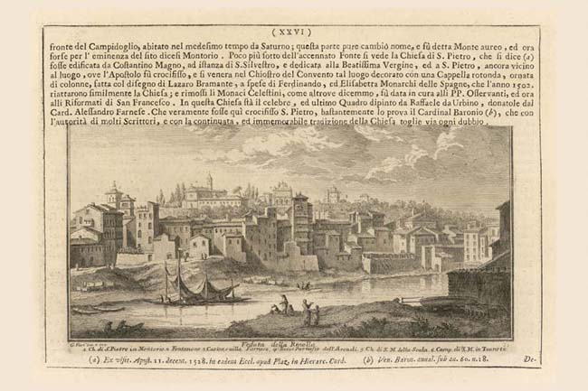 In this volume Vasi depicts two sandy river banks which once faced each other across the Tiber. This view shows the Renella on the Trastevere side which mirrored a companion view, the Spiaggia della Regola, Plate 90, on the opposing bank. "Renella" derives from the word arena (sand). The name is repeated in a Vicolo della Renella (NN 1173) which approached this site from the left, just off the print. Trastevere was occupied mostly by modest houses, like the ones we see in this view. Only the churches rise above the houses: on the left, the bell-tower of the church of S. Maria in Trastevere (6) Plate 60, and the facade of S. Maria della Scala (5) on the right. The Janiculum hill in the distance is topped by the church of S. Pietro in Montorio (1) with the tip of the dome of Bramante's Tempietto (NN 1187) protruding from its courtyard; the great Acqua Paola fountain (2) built by Paul V Borghese (1605-1621); the Giardino Farnese (3) Plate 198A; and to its right, the tower at the top of the gardens of Palazzo Corsini from which Vasi drew his great Panorama. Part way up the hill (between the Acqua Paola and the Giardino Farnese) is the entrance to the garden known as Bosco Parrasio (4) which was the meeting place for the Arcadian Academy.
