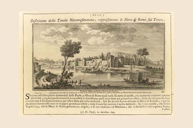 This river view might well have been included in Vasi's first volume on the city gates because it shows an exceptional view of the 3rd century Aurelian walls in which many of those gates opened. Indeed at the extreme right edge of the print we see the 1st century BC Pyramid of Caius Cestius (4) incorporated into the city walls next to the Porta Ostiense also known as Porta S. Paolo, Plate 11. At the river's edge the walls take a right angle and follow the river upstream. Rising above that angle of the walls is the Monte Testaccio (3), a refuse hill made up entirely of broken amphorae from the ancient river port nearby. On the far left the Paul V fountain (1) and the church of S. Pietro in Montorio (2) are seen on top of the wooded Janiculum hill which slopes down to the multiple church spires of Trastevere. Vasi’s large Patriarchal view of S. Paolo Fuori le Mura compounds a view of the Aventine Hill with Monte Testaccio showing the same stretch of Aurelian walls and the Pyramid seen in this print.