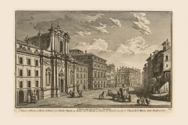The late Baroque church of SS. Celso e Giuliano, designed and built in the 1730s by De Dominicis, replaced an early Christian church which once faced onto Piazza di Ponte from which this view was taken. The real subject of this print is actually a fairly narrow street named, at that time, Strada de'Banchi (NN573) which is enlarged to look like a piazza. Vasi widened this important street graphically in order to better reveal its sides and perhaps to underscore its stature as the major link between the Vatican and the rest of the city. This short street, which extends the axis of the bridge leading to Castel S. Angelo, was known as Canale di Ponte a reference to both the bridge "ponte" and the fact that it was the first street in this area to flood when the Tiber overflowed its banks. Significantly Ponte is also the name given to the entire rione which contains this view. In the Renaissance, Strada de'Banchi was Rome's Wall Street, lined with banking establishments, which were supervised by the Zecca (4) (mint) at the head of the street. Antonio da Sangallo the Younger designed the concave facade of this building during the reign of Leo X Medici (1513-1521) making it the first curved facade of the Renaissance. Vasi's title for the old Zecca indicates that by then it had become the Banco di S. Spirito, founded by the hospital of that name, Plate 171, in Borgo. The street is still called Via del Banco di S. Spirito even though that bank was absorbed by the Banca di Roma in the late 1990s. Strada de' Banchi was part of the Via Papale, the papal processional route linking the Vatican to the Lateran. The Possesso procession (when each newly elected Pope would take possession of the Lateran) passed through here and continued on the Via dei Banchi Nuovi, Vasi's Strada Papale (3) on its way to S. Giovanni in Laterano. In the evening, the procession would return along Via dei Banchi Vecchi (5) on its way back to the Vatican passing the small church of S. Maria dell Purificazione (6) barely visible in Vasi’s print. The beginning of a third major street intersecting Strada de' Banchi is the ancient Via Recta, Vasi's Vicolo di Panico (2) exiting on the left between the church block and the early 16th century Palazzo Alberini (1) misnamed Alberici by Vasi.