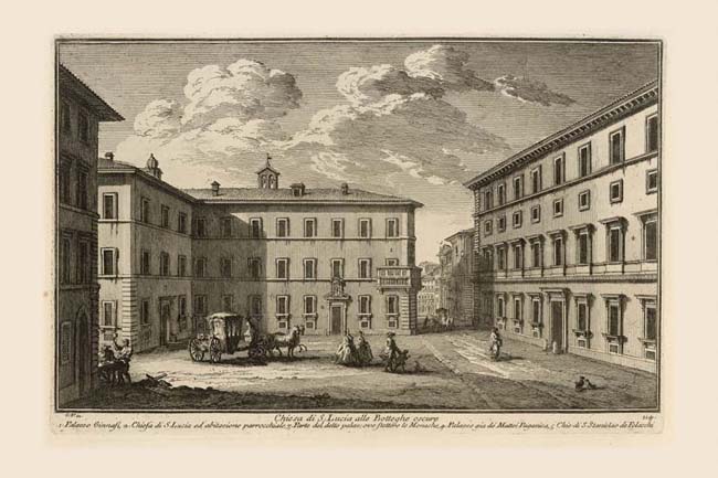 Nothing is left of the church of S. Lucia (2) today because the whole wing of Palazzo Ginnasi (1) facing us was demolished in the 1930s to widen the street we see on the right, known as "the street of the Dark Shops" (Botteghe Oscure) a condition which can be confirmed in the satellite image. The building attached to the left of this palazzo houses the associated nunnery (3). Nolli shows the street to be the border between Rione Pigna (on the left) and Rione S. Angelo. The church was unusual in that it lacked a true facade, being entirely encapsulated by Palazzo Ginnasi except for its front door. In this respect it resembles S. Lorenzo in Damaso enclosed within the Palazzo della Cancelleria, Plate 74. On the right is the facade of Palazzo Caetani (4), built by the Mattei family in the late 16th century. It was one of four Mattei palazzi, Plate 78, occupying the whole block which grew up on the site of the 1st century AD Theater of Balbus. The great rectangular court of that theater (Crypta Balbi) is occupied by the block beyond Palazzo Caetani on which we see the early 18th century facade of the church of S. Stanislao dei Polacchi (5), the Polish national church, which still functions as such to this day. Via delle Botteghe Oscure leads to the site of the next print in this series, Chiesa di S. Marco, Plate 115.