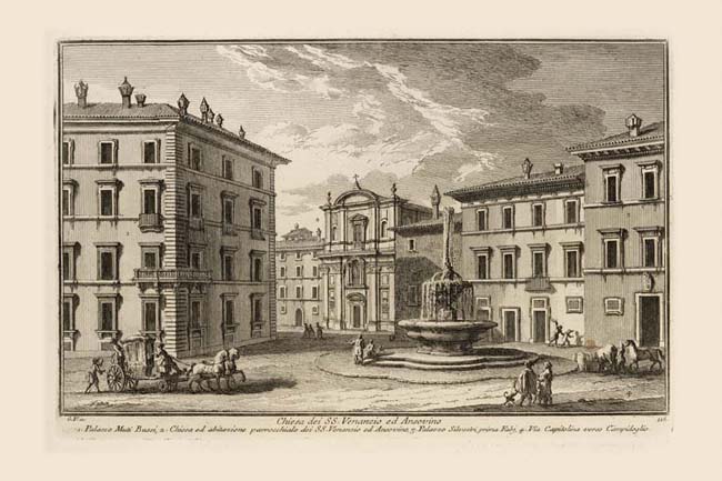 Except for the fountain and the 17th century Palazzo Muti Bussi (1) on the left, all of the buildings in this print were demolished in the late 1920s. Thus was lost the definition of the bow-tie plan of Piazza d'Aracoeli, the urban space leading to the stair-ramp (cordonata) of the Campidoglio, Plate 80. The long piazza, whose plan resembled that of Piazza di Spagna, was part of the section of the Via Papale (the papal processional route) connecting Piazza del Gesù to Piazza del Campidoglio. The carriage on the left of the print is moving along that route on Via Capitolina (4) in the direction of the Capitoline hill. The fountain at the center, designed in 1589 by Della Porta, was altered in the 19th century when it lost its scalloped base. To the right of the fountain horses are enjoying a drink at the trough which can be seen on the Nolli plan as well. The church of SS. Venanzio e Ansovino (2) was originally known as S. Giovanni in Mercatello, a reference to the market (mercato) which took place in this piazza until the late 15th century. Vasi shows the 1720s reconstructed version of the church, flanked on the left by its parish house. On the right the 16th century Palazzo Silvestri (3) is close to the midpoint of the long piazza.