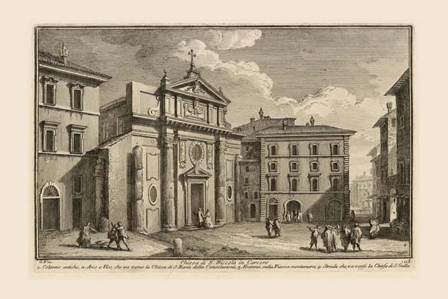 The early Christian church of S. Niccolò in Carcere was converted from an ancient temple whose front columns (1) are visible in the church facade. The ancient building was one of three side-by-side Republican temples in the Forum Holitorium near the Theater of Marcellus, Plate 30, which can just be seen rising above the building facing us. The nave of the church occupies the center temple, while the side aisles are in the spaces between the center temple and the two smaller temples flanking it. The side rows of columns of these two temples became the side walls of the church, as can be seen in the shaded left corner of S. Nicola where a single ancient column is incorporated into the wall. On the right side of the print, Vasi does some topographical reconfiguration. From his point of view in front of the church, he would not have been able to see the fountain in Piazza Montanara (3). Furthermore the arch and alleyway (2) (Arco e Vico che va...) do not open onto the space in front of the church, but rather onto the street which leads to Piazza Montanara. The Nolli plan shows the correct location of the alleyway that he calls Vicolo della Bufala. The "street that goes toward S. Galla" Strada delle Carrozze (4) was a continuation of the street leading to Piazza Montanara. With the exception of the church and the Theater of Marcellus, all the buildings and streets shown in this print disappeared in the 1930s for the building of Via del Mare, the present Via del Teatro Marcello.