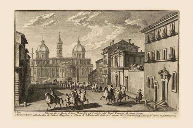 The impressive cavalcade of carriages and horses moving toward us along the Via Felice appears to be heading for the door of the hospice (3) in the title of this print. Via Felice was one of the streets built under Sixtus V Peretti (1585-1590) radiating from the Basilica of S. Maria Maggiore (1) whose rear facade is the real protagonist of this view. The domed chapel on the left of the church was built by Sixtus V, who also had the obelisk taken from the Mausoleum of Augustus) placed in the piazza at the end of the street. The symmetrical domed chapel on the right was added by Paul V Borghese (1605-1621), who was also responsible for placing the column, visible to the left of Sixtus V's dome, in front of S. Maria, Plate 48. Both the 16th century church of S. Maria della Sanità (2) and the hospice of St. Paul were demolished at the end of the 19th century to make way for the modern Piazza del Viminale. Vasi provides a second view of this scene in one of his four large prints of the Patriarchal basilicas. In that version the view is more comprehensive being taken from an elevated vantage point further back on the Via Felice at the intersection marked by the Quattro Fontane, Plate 36A.
