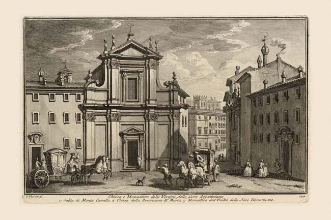 While both churches in this print date from the 1680s, S. Maria delle Vergini by Mattia De Rossi retains the strict two-level facade associated with the late Renaissance, while S. Maria dell'Umiltà (2) by Carlo Fontana has a more unified Baroque facade framed by giant-order pilasters. Its adjacent Domenican convent (3) flanks it to the right. The carriage in the foreground, which narrowly missed running over the gentleman headed for the church of the Vergini, has come from Via dell'Umiltà, which becomes the Salita or Ascent of Monte Cavallo (1) now Via della Dataria) as it climbs up to the Piazza del Quirinale, Plate 61. The street on the left leads to the Fontana di Trevi, Plate 104, which is only fews steps away.
