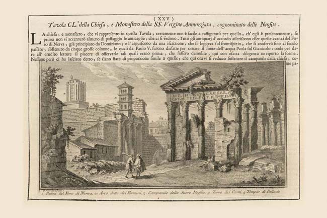 This is a rare excursion into reconstruction of ancient ruins by Vasi, who, like Nolli, concentrated most of his efforts on the contemporary city. The justification for the view is that it depicts the convent and campanile of the Dominican Neophyte nuns (3) from a different angle than in the closely related print of both it and S. Maria Annunziata, Plate 150. The medieval church and monastery of the Annunziata were built into the late 1st century BC Temple of Mars Ultor which backed onto the great perimeter wall of the Forum of Augustus which Vasi mistakenly refers to as part of the Forum of Nerva. It is no coincidence that the only surviving columns of that temple correspond to the edge of the medieval building where their static properties provided a convenient structural reinforcement. The bell tower was demolished in 1823, while the church and convent were destroyed during the excavations of the Forum of Augustus in the 1930s. Part of that forum is the Arco del Pantano (2) which gave access to the ancient Suburra neighborhood. Dominating the right half of the print is the Temple of Minerva in the Forum of Nerva. This no longer existed in Vasi's day, having been demolished by Paul V Borghese (1605-1621). In his text Vasi notes that he is presenting a reconstruction of the vanished temple which he calls the Tempio di Pallade, probably based on an earlier image such as the 1577 Duperac print. Vasi imagines the site cleared to the right so as to view the only surviving columns which lined both sides of Nerva's forum the two columns, known as the colonnacce (5) are featured in the related Vasi view, Plate 53A. Another Vasi error of nomenclature is the medieval tower rising on the left: he calls it the Torre dei Conti (4) but it is actually the Torre delle Milizie, built on the Markets of Trajan.