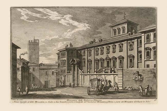 The Filippines were dedicated to the memory of the Counter Reformation saint Filippo Neri, whose main church and monastery is S. Maria in Vallicella, Plate 137, commonly known as the Chiesa Nuova. In this print, the impressive façade of the monastic complex with elaborate curved double stair (2), corner pavilions and tall entrance gate (1) does not look like the type of humble convent that the austere saint would have approved. That is because it was originally built in the early 18th century as the suburban villa of the Sforza family. In the print the street along the right side of the building is still named Via Sforza (NN 160). The villa was taken over by the Filippine nuns in about 1740. At the end of Via dei Quattro Cantoni on which the monastery faces, we see that part of the convent of S. Lucia in Selci (3) Plate 143,which was demolished in the late 19th century to make way for Via Giovanni Lanza. Behind it is the same medieval tower of the Capocci visible in Plate 155.