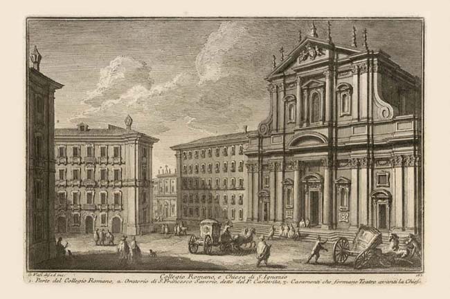 The church of S. Ignazio is dedicated to the founder of the Society of Jesus, the major counter-Reformation order usually referred to as the Jesuits, or the "shock troops of the Pope" in the fight against the Protestant Reformation. Orazio Grassi, a Jesuit mathematician, designed the church in the 1620's. Together with the adjacent building (1), it completed the extensive block of the Collegio Romano, Plate 162. In the distance is the Oratorio della Caravita (2) which Vasi indicates as dedicated to St. Francis Xavier, but Nolli refers to as S. Maria della Pietà. Although appearing recessed from the face of the church in the print, its facade is actually on the same line as that of S. Ignazio. Vasi sets it back from that line, perhaps to show the presence of a street separating the two blocks. On the left we see two wings of Raguzzini's early 18th century Piazza S. Ignazio (3) which reshaped the space in front of the church as a scenographic display of curvilinear residential buildings acting as a spatial foil to the great facade. The contiguous view of the Seminario Romano, Plate 165, shows another aspect of Raguzzini's complex immediately to the east.