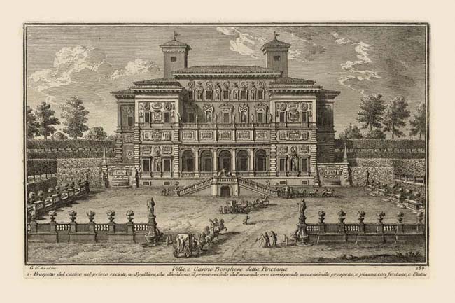 Soon after his uncle was elected Pope Paul V (1605-1621), Scipione Borghese built the Villa Borghese (1). With some justification the Neoclassic sculptor Antonio Canova referred to this as the most beautiful villa in the world. The site chosen was a family plot just outside the Aurelian walls, near Porta Pinciana, Plate 2. Gradually the cardinal acquired more land which made this the most extensive villa in Rome at the time. The plan of the casino, designed by Flaminio Ponzio, consists of two projecting wings joined by an arched portico with lateral espaliered garden walls (2) separating the entry court from the rear fontain. In its basic form casino recalls that of the Villa Farnesina, Plate 88A, built a century earlier by Agostino Chigi. The casino and a considerable portion of the villa's gardens appear on the Nolli map, which shows the main entrance to the grounds to be located near the sharp angle in the Aurelian walls known as the Muro Torto, Plate 1A. The distance from Palazzo Borghese, Plate 69, to this gate about equaled the distance from the gate to the casino. Thus the family could drive from their city residence to the gate of their suburban villa in a matter of minutes, and then cross the pleasant park of their villa from one end to the other, finally arriving at the casino, as the three carriages in this view seem to be doing. The law of the gardens (see Plate 188) enabled the city to expropriate the villa in 1901 and turn it into a public park.