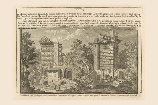 The title, Disegno dell'Anticaglia (1) refers to a large fragment of entablature from the ancient Temple of Serapis, still visible today in the Colonna garden, Plate 193. The temple was built on the top of the Quirinal hill by the emperor Caracalla (211-217), with a long, wide stair leading down to the Campo Marzio level. Most of the print reproduces a view by Bernardo Gamucci of 1565 (2) which shows the ruined status of the temple after the middle ages, but much of this was destroyed in 1625. Nolli represents the remains of the stair and part of the temple in thick black lines. These remains were used as foundations for the Casino nuovo (new building) on the Vasi view of the Colonna garden. Most of this structure was demolished to make way for the Pontifical Gregorian University built in 1930, facing onto Piazza della Pilotta (NN 293).