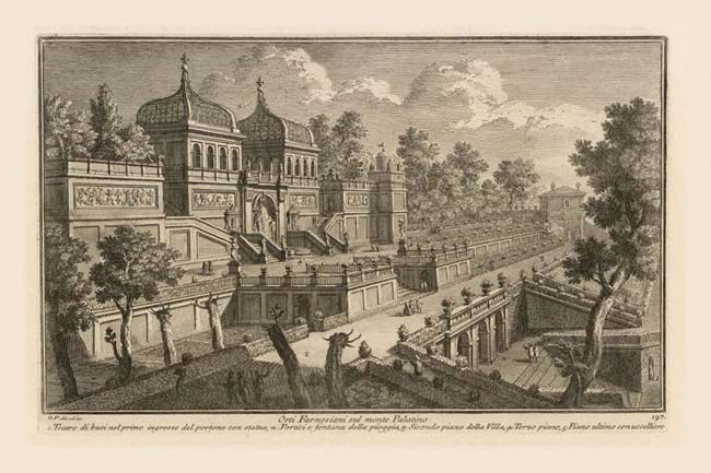 Another of Vasi's rare elevated views shows the terracing effect of the Orti Farnesiani designed by Vignola which Nolli calls the Villa Farnesiana. Since it did not have a casino, but only the two pavilions which Vasi refers to as uccelliere (5) (bird cages or aviaries) this does not really qualify as a villa. Thus Vasi's use of Orti (gardens) is more exact, though he does use "villa" in one of the captions. In fact the Farnese already had a suburban villa, known as the Farnesina, Plate 88A, across the river from Palazzo Farnese, Plate 73. In the mid 16th century Cardinal Alessandro Farnese started the long building process completed more than 50 years later by his great-nephew Cardinal Odoardo Farnese. Vasi does not depict the orti themselves, which covered about half the area of the top of the Palatine hill but Nolli shows them to their full extent. Vasi illustrates the elaborate terraces leading up to the orti from a gateway at the level of the Roman Forum. This entrance was just to the right of the semicircular statue-lined teatro (1) shown on the lower right. In his caption Vasi enumerates the levels, also referring to an underground fontana della pioggia (2) (rain fountain) behind the portico. From this fountain underground ramps lead up to the next level (3) where two figures can be seen emerging from a door next to the central ramp. The third level presents a yet another terrace with bifurcating staire in the manner of the Casino Pio IV, Plate 182. In the early 17th century the orti became the first botanical garden in Rome only to be largely demolished in the 19th century during extensive archeological excavations of the Palatine hill and the Roman Forum, Plates 32, 54. Although not exactly on the cross axis of the Basilica of Maxentius opposite, visually the twin pavilions, which are slightly splayed apart, appear to acknowledge its axis in general terms. Each pavilion provides a different prospect, one directed toward the Campidoglio the other inflected toward the Colosseum.