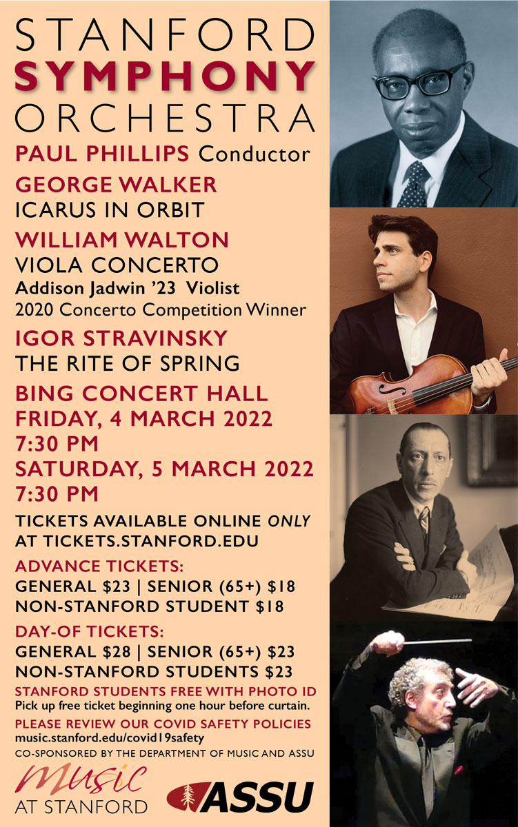 On March 4 & 5, Stanford Symphony Orchestra performed Igor Stravinsky’s epic ballet score The Rite of Spring. These Winter Concerts, conducted by music director Paul Phillips, celebrated the centenary of the birth of George Walker with a performance of his composition Icarus in Orbit and featured Concerto Competition winner Addison Jadwin ’23 as viola soloist in William Walton’s Concerto for Viola… Read more Stanford Symphony Orchestra performs Walker, Walton, and The Rite of Spring