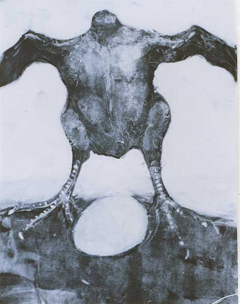 The symposium asks: “Are we the product of our genes or our experiences?” and provides a discussion of studies “strongly suggesting that development is not the exclusive product of either nature or nurture but rather of their interaction.” This monotype portrays the apparent resolution of the age-old chicken-egg debate, featuring perhaps the best-known subject of artificial selection. The artist notes: "Chicken and Egg is my way of contemplating any kind of paradox- the