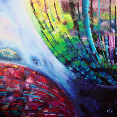 Binary stars, or two-star systems excite awe and wonder: massive stars which are close enough no doubt influence each other, and probably have a symbiotic relationship, affecting one another's evolution--cosmic analogs of living symbionts on Earth. The painting depicts a set of such binary stars--one with warmer colours, and the other a cooler companion. Would these two bodies remain united by the bond of their mutual gravitation towards each other? Would one consume the other? Would they be progenitors of other stars?