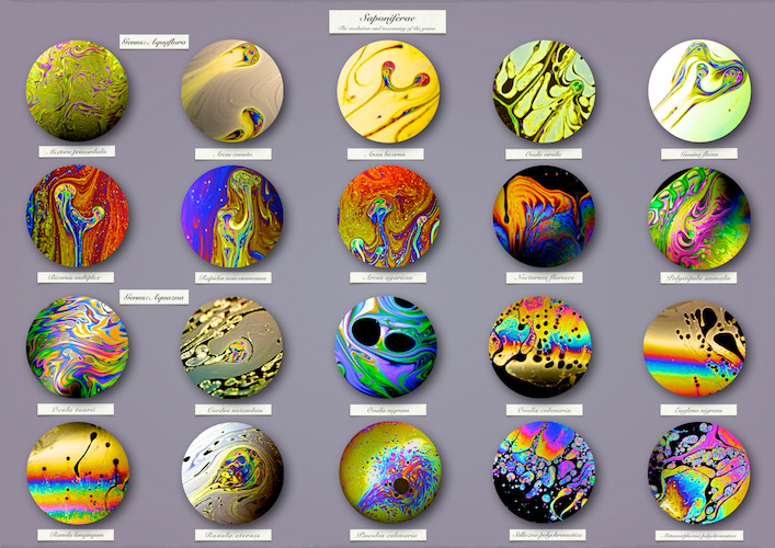 This is a collection of images of soap film--arranged like museum samples--that were collected over several weeks using both vertical and