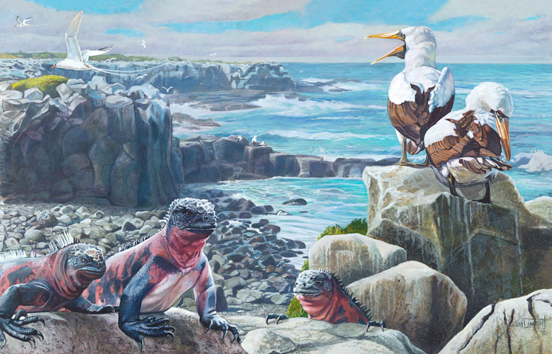 Hood Island, also known as Española, is the southernmost island in the Galapagos chain. Its distinctive fauna sets it apart from the other islands in the archipelago. Darwin’s observations of deviations within a species or genus from island to island heavily influenced his theories of evolution and natural selection. The seven subspecies of Marine Iguana presumably evolved from the same ancestor as the inland land iguanas (Conolophus spp.), an example of adaptive radiation. Males of the Hood Island subspecies, A. c. venustissimus, develop the striking breeding colors depicted here.