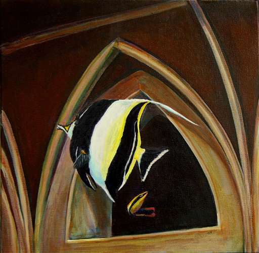 The painting Ablution plays on the religious ritual of cleansing, through washing.To emphasize this, I have placed the Moorish Idol, a fish that habitually seeks cleaning, and the Hawaiian Cleanser Wrasse, a fish that performs it, in a church archway.