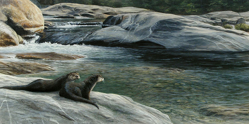 As an artist, my eye was caught by the repetition of curved shapes between the rocks, the water and the otters. As a naturalist, I was intrigued by the causal linkages between those repeating forms. My intent with the composition was to allude to deeper natural relationships beneath the otherwise hopefully alluring scene. Particularly, an expanded, extreme and slightly tweaked example of convergent evolution, or homoplasy employing evolution on the one hand and erosion on the other; where the rocks are formed by eons of moving water and the River Otters are formed by eons of moving through water.