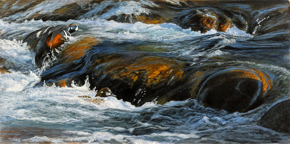 Harlequin Ducks seek rapids for breeding and rearing young. They are named for a comic theatrical character, whose traditional costume is recalled by their strikingly patterned and colored plumage. Indeed, to look at them as depicted in field guides, it is a wonder that they aren’t all in the gullets of Gyrfalcons. However, when seen in their preferred breeding habitat and as I have taken pains to paint them here, it becomes obvious how evolution has fine-tuned them to their environment with the colors and shapes of rocks and current and even the flying flecks of foam from the whitewater.