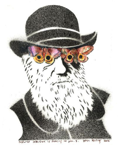 The succession of species, their "blooming" periods and extinctions, puzzled 19th Century naturalists. Then, Charles Darwin identified natural selection as the key mechanism of evolutionary change. In this image, Darwin's "fancy" eyes are the eyespots on moth wings that mimic the eyes of predators, an iconic example of change through natural selection. The bowler hat is a reference to the surrealist painter, René Magritte, for whom it was a symbol of the bourgeois. Indeed, in the typically narrow mindset of Darwin’s day, even hinting at procreation was not done. So it certainly marks his genius that he opened his eyes to the vistas offered by natural selection--despite his hat.
