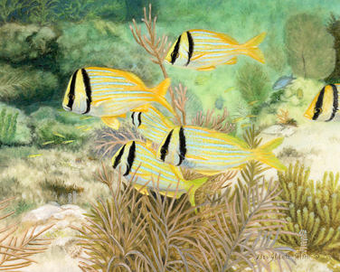 Science Art-Nature: Bev Abbott has successfully shown how the two black bars can serve to confuse predators. The fish appear to have one bar on each side of the head and thus appear to be turning toward the viewer rather than toward the left.