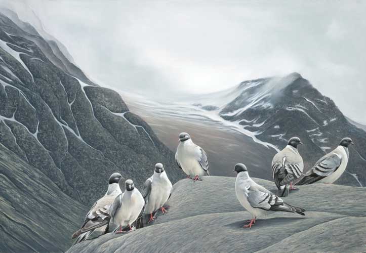 The original concept for this painting was to position the Snow Pigeons (Columba leuconota) in the foreground with an Egyptian Vulture (Neophron percnopterus) soaring above. As the piece evolved it became apparent that although my idea worked in concept, it wasn’t going to work compositionally. In 2007, I was privileged to study these species in their natural habitat in the Himalayas of northern India. Snow Pigeon populations appear to be stable, and are currently ranked by the International Union for Conservation of Nature as a species of Least Concern. Sadly, in 2007 the Egyptian Vulture was up-listed from Least Concern to Endangered following an extremely rapid population decline. This decline was due to the widespread veterinary use of the NSAID Diclofenac, which accumulated in the vultures after consuming the carcasses of domestic livestock. The results were deadly for the vultures. It is with bittersweet memories that I look at my painting and rejoice in the presence of the pigeons while mourning the absence of the vulture.
