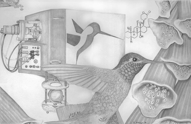 As if taking a cue from nature, where Black-chinned Hummingbirds (Archilochus alexndri), sample Foxglove (Digitalis purpurea), a mass spectrometer, this one a Micromass LCT with its iconic hummer design, samples the cardiac glycosides in Foxglove.