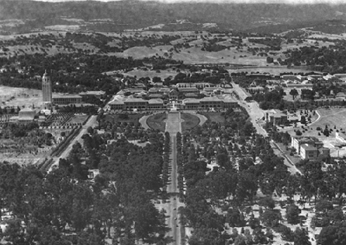 Stanford University Archives photo taken about 30 years after the preceding aerial, showing a mowed -- but divided -- Oval with tangential areas containing more trees and the open space beyond the central campus slightly diminished. Note: Lake Lagunita in upper right [ * ] At about this time, (1954) the revised record of commonly seen campus birds still lists 71 species, noting: