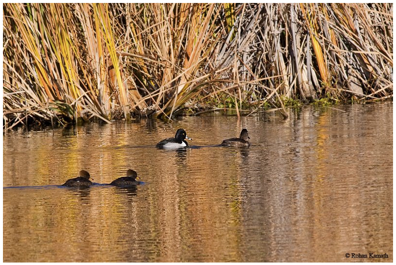 Ringed Neck Duck (Aythya collaris) [Hooded Mergansers (Lophodytes cucullatus) in front] © Photo by Rohan Kamath Return to Species List