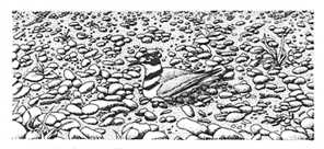 disappears. Iridescent colors are produced by differential reflection of wavelengths from highly modified barbules of the feathers that are rotated so that a flat surface faces the incoming light. The detailed structure of the barbule reflects some wavelengths and absorbs others, and the reflected wavelength changes with the angle of reflection. The structural color is registered by the eye in response to the reflected wavelengths and changes with the angle formed by the light, the reflecting surface, and the eye. Just as bird songs did not evolve to please the human ear, bird colors did not evolve to delight our eyes. The most spectacular colors typically function to impress members of the same species. The classic example is the tail of the peacock, but the brilliant colors of the breeding male Scarlet Tanager or male King Eider illustrate the same phenomenon. Nondemonstrative colors frequently help a bird avoid predation. The camouflage of a King Eider female on its nest is an example of such cryptic coloration. Many inconspicuous birds exhibit what is known as "countershading"; they are darkest along the back, and gradually become lighter until the belly is pure white. Countershading tends to eliminate a sharply defined shadow, since the bird absorbs the most light above, where the light is brightest, and reflects the most light below, where the light is dimmest. The vast majority of shorebirds are countershaded, although as in the Snowy Plover the division between darker back and lighter belly may be rather sharp. "Disruptive" coloration -- the use of striking patterns to break up the outline of the bird -- is another technique for avoiding detection. Killdeer and Semipalmated Plovers, for example, are very difficult to see in some circumstances. The extreme in cryptic coloration, of course, is found among those birds that simply take on the color of the background against which they live. Ptarmigans in their pure white winter plumage are the classic example. Birds often use colors to identify themselves to other members of their flock and thus to hold it together. Examples are the color patterns revealed in flight by shorebirds such as Ruddy Turnstones and Willets. Colors, such as those inside the mouths of gaping chicks, may also function to stimulate parental feeding. Other colors may direct the feeding movements of the young, as does the red spot on the bill of the Herring Gull, which encourages the young to solicit food and to stick its head into the adult's mouth. Some colors are apparently produced incidentally by pigments deposited for other reasons. For instance, feathers of the wingtips are subjected to more wear than those nearer the base of the wing. And feathers containing pigments are more resistant to wear than those without. That is thought to be the reason that the wingtips of many mostly white birds, such as many gulls, terns, pelicans, and gannets, are dark. Disruptive coloration in the Killdeer. The alternating bands of white and black on the head and neck break up the outline of the bird and make it more difficult to see against a variegated background than a bird that is uniformly light or dark. |