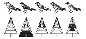 distinguished, MacArthur found that each warbler species divided its time differently among various parts of the tree. The Cape May, for instance, stayed mostly toward the outside on the top, the Bay-breasted fed mostly around the middle interior, while the Yellow-rumped moved from part to part more than either of the other two. This is shown in the accompanying diagrams, in which the zones that contained 50 percent of the birds' feeding activity are blackened. MacArthur also recorded details of the warblers' foraging habits and discovered that they differed too. For example, the Cape May warbler hawks flying insects much more often than does the Blackburnian and tends to move vertically rather than horizontally (matching its tendency to remain on the outside of the tree). The Black-throated Green hovers much more than the Bay-breasted, and the more variable Yellow-rumped has the most varied feeding habits. In addition, MacArthur found evidence that food shortage limited the size of the warbler populations. Overall, MacArthur concluded that "the birds behave in such a way as to be exposed to different kinds of food." They also have somewhat different nesting times, and thus the times of their peak food requirements are not the same. They are partitioning a limiting resource -- their supply of insects, and, in the process, occupying different niches. |