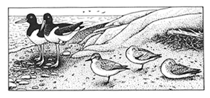 evaporation. When it is cold, the lack of insulation on the legs makes them a site of potential heat loss. To minimize such loss, the arteries and veins in the legs of many birds lie in contact with each other and function as a countercurrent heat exchange system to retain heat. Arterial blood leaves the bird's core (trunk) at body temperature, while venous blood in the bird's foot is quite cool. As the cool blood returns toward the core, heat moves by conductance from the warm arteries into the cool veins. Thus, arterial blood reaching the feet is already cool and venous blood reaching the core has already been warmed. In addition, by constricting the blood vessels in its feet a bird may further decrease heat loss by reducing the amount of blood flow to its feet at low temperatures. Thus while the core temperature of a duck or gull standing on ice may be 104 degrees F, its feet may be only slightly above freezing. Behavior also can play a significant role in reducing the amount of heat lost from unfeathered surfaces. By standing on one leg and tucking the other among its breast feathers, a duck or gull on ice reduces by half the amount of unfeathered limb surface area exposed; by sitting down and thus covering both legs, heat loss from the limbs is minimized. In cold weather, juncos, sparrows, and other finches foraging on the ground frequently drop down and cover their legs and feet with their breast feathers while pausing in their search for food. On cold or windy days, shorebirds often can be seen resting with their beaks tucked away among their feathers, sometimes combined with standing on one leg or sitting. And, of course, birds can further enhance their effective insulation by fluffing out their feathers to increase the thickness of their "coat." Behavioral thermoregulation may be accomplished by other means, as well. Subtle changes in posture or orientation toward or away from the sun can alter heat gain and loss. Gulls, for example, usually nest in open habitats with little or no available shade and often face problems of overheating. Nesting Herring Gulls will rotate 180 degrees to constantly face the sun on hot, windless days. This effectively minimizes the amount of radiative heat gain by minimizing the surface area exposed to direct solar radiation and by allowing the gulls to present only their most reflective plumage (white head, neck, and breast) to direct sunlight. Gulls use their unfeathered legs and feet to prevent overheating by standing -- better yet, by standing in water. Gull chicks lack thermoregulatory ability until they are several days old and face acute problems of overheating. In many shadeless colonies, such as those of California Gulls, chicks avoid heat stress by standing in the shade provided by their parents. In cooler weather, rather than increasing their metabolic rate, birds can save energy by using environmental heat to raise their body temperature passively. Anhingas, for example, do this by sunning with wings spread, while many small- and medium-sized species, especially passerines, assume sunning postures in which they squat or sit with their feathers slightly erected and wings drooped. Usually the bird is oriented so the back is fully exposed to the sun's direct rays. Interestingly, Greater Roadrunners and some grebes that sunbathe in this way have either back feathers with black bases or black-pigmented back skin, both of which presumably facilitate heat absorption. Birds have evolved the ability to maintain their body temperature at a somewhat lower level during periods of inactivity or in response to food deprivation. This "regulated hypothermia" achieves significant energy savings for many species ranging from passerines to raptors. For example, when deprived of food in winter, Red-tailed Hawks drop their nocturnal body temperature by 5 to 7 degrees F below their daytime temperature. Hummingbirds, swifts, and poorwills enter a state of torpor in which body temperature may drop as much as 50 degrees F for several hours during the night or for days during extremely inclement weather. Although the energy savings are great in birds that enter torpor, they face increased danger of predation because they are unable to respond quickly. There is also a substantial metabolic cost incurred by arousal from torpor that demands immediate payback in food intake. Nevertheless, recent studies indicate that the ability to enter shallow torpor for short periods may be much more widespread among birds than previously believed. Keep thermoregulatory needs in mind when you are watching birds. Indeed, temperature-regulating actions of shorebirds and gulls are among the most readily observed and interpreted of bird behaviors. |
