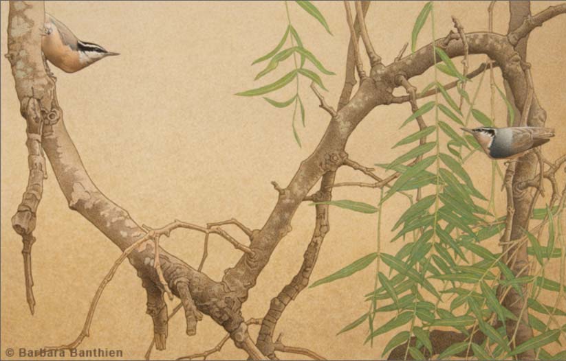 Science Art note: If there is enough food during winter, Red-breasted Nuthatch pairs may remain together on their feeding territory throughout the year. |