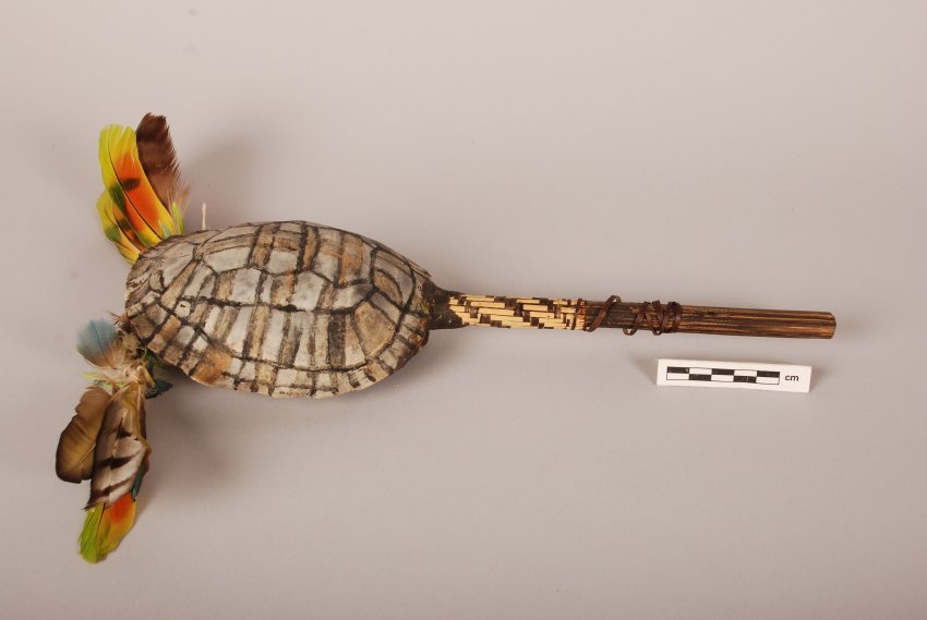 The Karajá are an indigenous tribe that in the 20th century numbered approximately 45,000. Today, their numbers have dwindled to approximately 3500 due to violent historical encounters with Europeans. Their society is built upon a self–sufficient hunter–gatherer structure. They are also the makers of an object donated by Charles A. Wilhelmson to Stanford University's archaeological collections in 1960: a feathered rattle (Object ID 60.260) that, even at first glance, is remarkable. Its shape is delicate–fitting due to its ceremonial use by high–status Karajá when celebrating local mythology during dry season festivals. A large turtle shell makes up the body, glinting pale blue, gray, and yellow between black outlines of its plates. It is carried via a wooden handle decorated with a checkered pattern of woven rattan. Most strikingly, the top end of the artefact sprouts large feathered tassels of vibrant yellow, orange, blue, green, and brown.