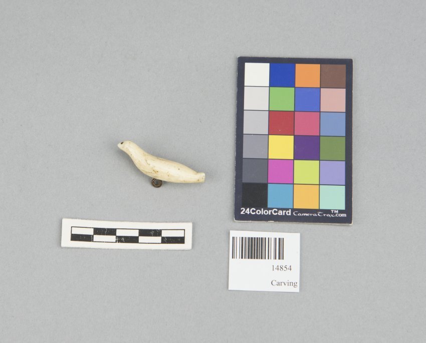 This figurine is one of a winter seasonal trio: three miniature cold–loving creatures carved of bone or walrus ivory. This little walrus has lost the tips of his tusks, but his eyes, made of orange–red glass beads, remain to lend a sense of personality (14851). A lean sea otter serves as the handle of a perforating tool (14853). And we can identify a tiny seabird as some sort of amulet from the small iron loop on his belly, which also calls to mind a perching bird's curled toes (14854). Unfortunately, we have no record of where in the circumpolar world these figurines originated or when, although we do know they entered Stanford's collections before 1939. Bone and walrus ivory carving has always been widespread throughout these regions. Small, naturalistic carvings like these three were commonly attached to hunting gear, storage containers, and boats, hung in dwellings, and even worn. They worked as charms, amulets, tools, and decoration. They also became very popular tourist souvenirs. These there were probably purchased as mementos of a trip to the North in the early 20th century.