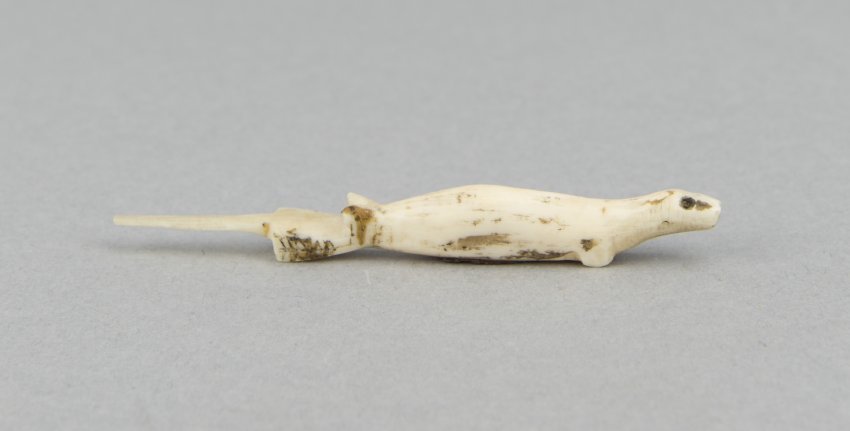 This figurine is one of a winter seasonal trio: three miniature cold–loving creatures carved of bone or walrus ivory. This little walrus has lost the tips of his tusks, but his eyes, made of orange–red glass beads, remain to lend a sense of personality (14851). A lean sea otter serves as the handle of a perforating tool (14853). And we can identify a tiny seabird as some sort of amulet from the small iron loop on his belly, which also calls to mind a perching bird's curled toes (14854). Unfortunately, we have no record of where in the circumpolar world these figurines originated or when, although we do know they entered Stanford's collections before 1939. Bone and walrus ivory carving has always been widespread throughout these regions. Small, naturalistic carvings like these three were commonly attached to hunting gear, storage containers, and boats, hung in dwellings, and even worn. They worked as charms, amulets, tools, and decoration. They also became very popular tourist souvenirs. These there were probably purchased as mementos of a trip to the North in the early 20th century.