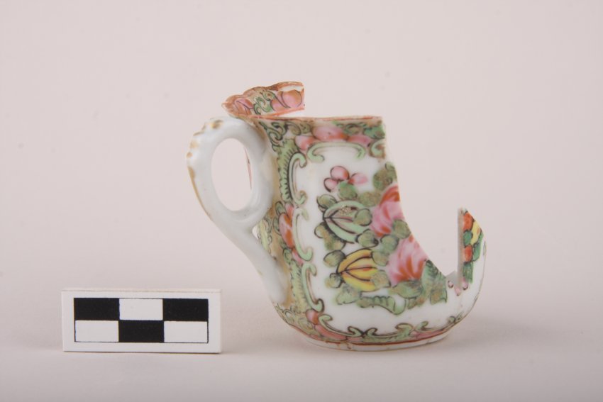 Chinese export porcelain demitasse coffee cup, finely hand painted with Chinese figures in conversation. Stanford Mansion site (Object ID 13.237.009).