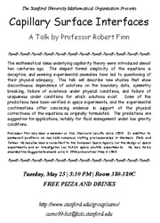 May 25, 1999: Professor Robert Finn, "Capillary Surface Interfaces", 5:30 PM, Room 380-380C