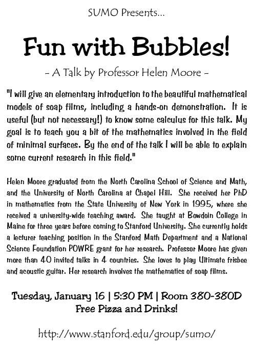 The Stanford University Mathematical Organization recently began a speaker series. The goal of the series is to let students listen to professors discuss their backgrounds and research, as well as to let students hear some interesting problems or ideas.