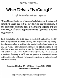 "One of the driving forces of a researcher is to prove and understand something you're sure is true, but can't see your way around. I will illustrate by explaining some of the amazing empirical findings connecting the Riemann hypothesis with the Eigenvalues of typical large matrices." Persi Diaconis has led a double career in magic and mathematics. He left home at age fourteen and made his living as a magician until age twenty-four, having started out as assistant to the greatest sleight-of-hand worker of the era, Dai Vernon. Following extensive training in the applied probability of card shuffling, he went back to college to learn the theory behind it, and continued with a Ph.D. in mathematical statistics at Harvard University. He was awarded a MacArthur Fellowship in 1982, and held positions in statistics at Stanford and in mathematics at Harvard. He is currently a professor of mathematics and statistics at Stanford. |