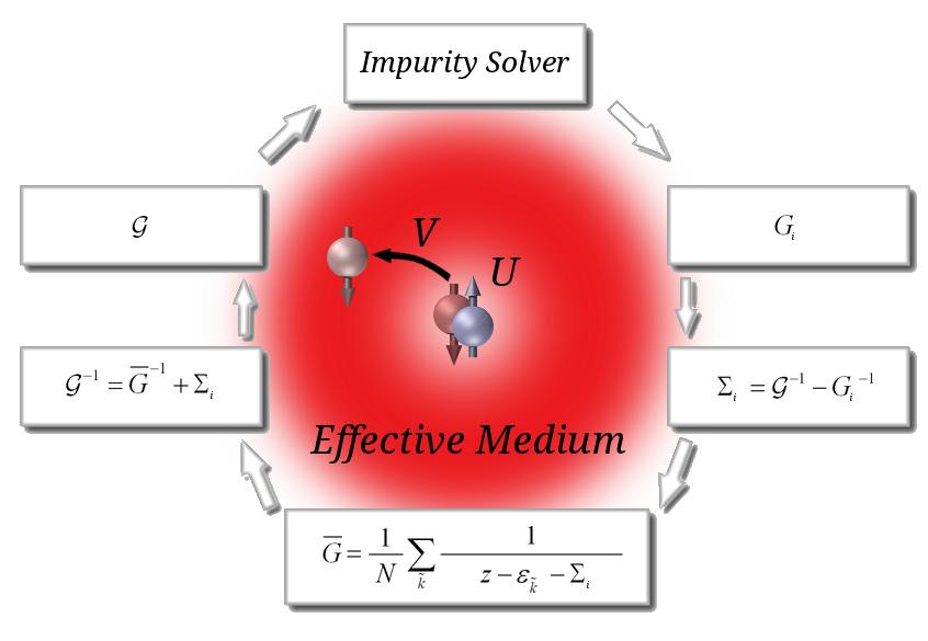 Cartoon depicting the self-consistency scheme of dynamical mean-field theory (DMFT). In the DMFT scheme one embeds a single-site impurity with full interaction in a non-interacting bath that contains information from the remaining lattice degrees of freedom. Unlike classical Weiss mean-field theory, the effective mean-field function retains dynamical or temporal information about quantum fluctations of degrees of freedom between the impurity site and the bath. DMFT can be extended by considering the embedding of a finite-size cluster in an effective medium in which case the mean-field function depends upon spatial or momentum-space degrees of freedom in addition to the temporal or frequency dependence. |