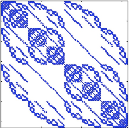 A schematic representation of a Hamiltonian in matrix form. The system in question has been represented by a Hilbert space with 1028 elements. The blue dots represent non-zero entries in the Hamiltonian matrix with the remaining elements (white space) equal to zero. The sparsity of this representation makes matrix methods like Lancozs or implicitly restarted Arnoldi and packages like ARPACK and PARPACK ideal candidates for finding the eigenvalues and eigenvectors of this Hamiltonian. |