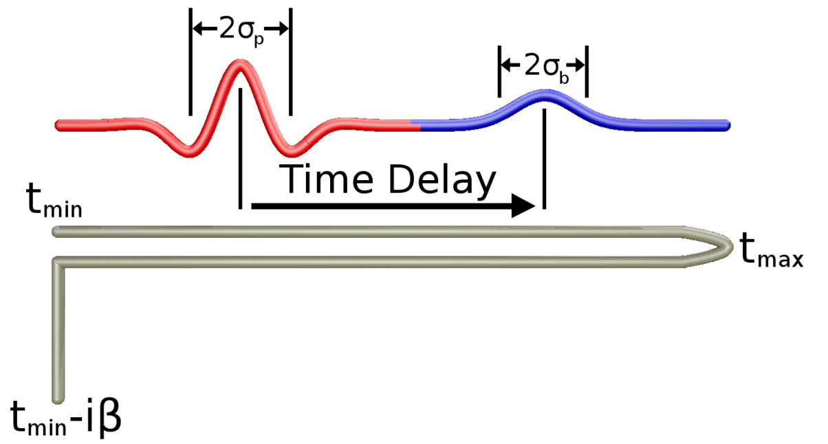 Schematic of the Keldysh contour used in our formalism. Time runs from some tmin, out to a tmax and back again, then down the imaginary time spur to account for finite temperature effects on the system in equilibrium. The red and blue curves represent the application of a transient pump pulse at some time after tmin and a subsequent probe pulse, like that used in time-resolved optical spectroscopy or photoemission. |