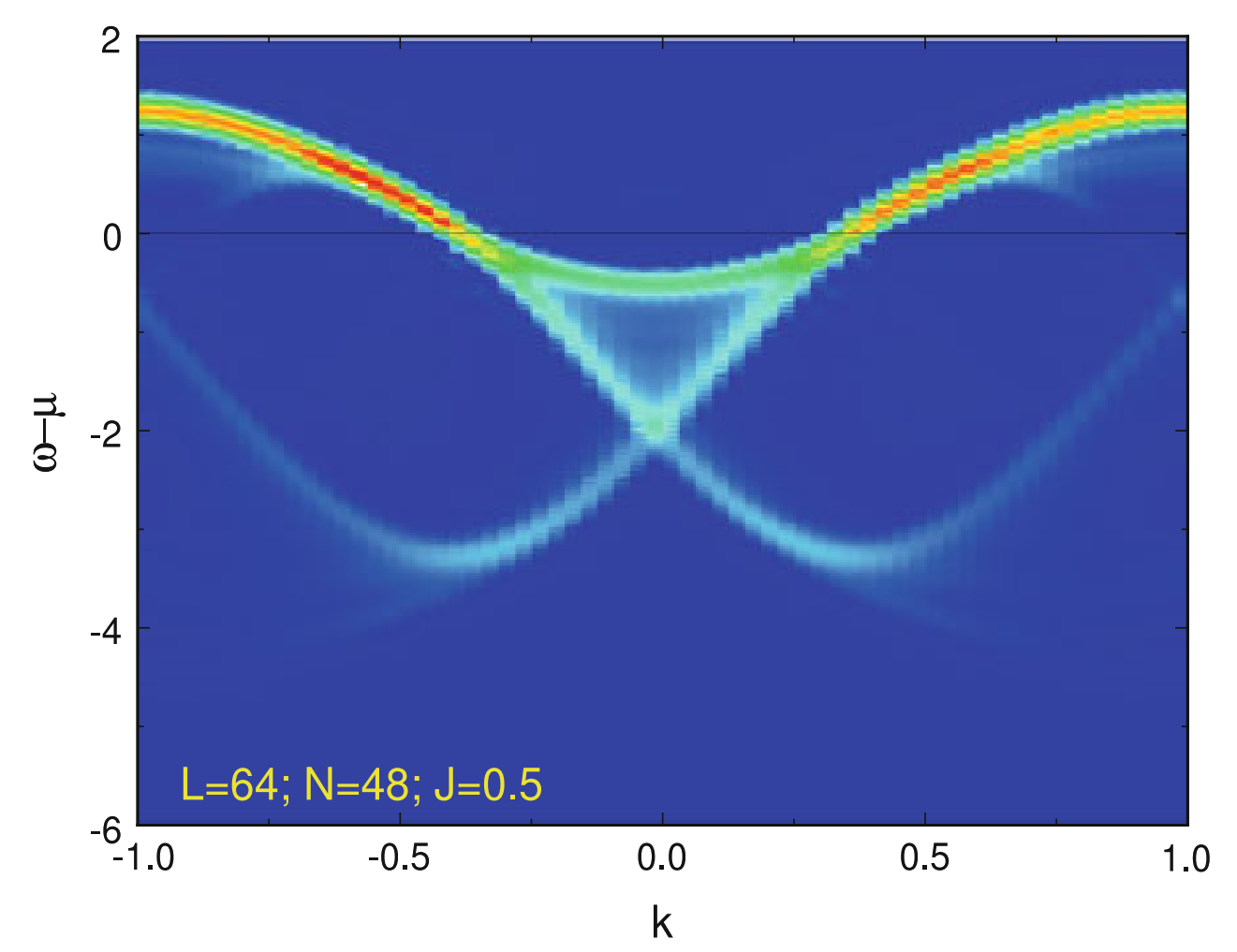 Momentum resolved spectrum of a t-J chain of L = 64 sites, with J/t = 0.5 and density n = 0.75, calculated with time-dependent DMRG. Figure from A. E. Feiguin, "The Time-Dependent Density Matrix Renormalization Group", in Strongly Correlated Systems, A. Avella and F. Mancini eds., Springer Series in Solid-State Sciences 176 (Springer, Berlin, Heidelberg, 2013). The density-matrix renormalization group (DMRG) method is one of the most powerful numerical techniques for studying quantum many-body systems in condensed matter physics. The time-dependent DMRG is a remarkable and reliable approach to simulate real-time dynamics of strongly correlated systems. It can be used to calculate spectral functions, and to study systems far from equilibrium, and provides valuable information about transport and thermodynamic properties which can be directly compared with real experiments, such as RIXS. |
