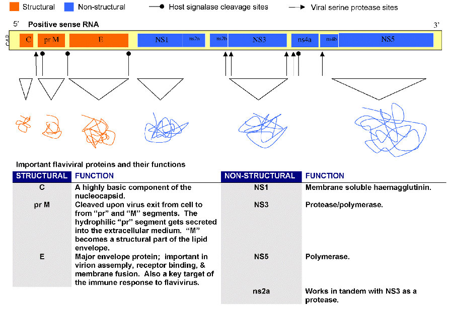 As shown above, the fl avivirus genome consists of a single strand of positive sense RNA. Upon translation several enzymes cut the single polypeptide into functional protein units. Some of the proteases are actually provided by the host cell.